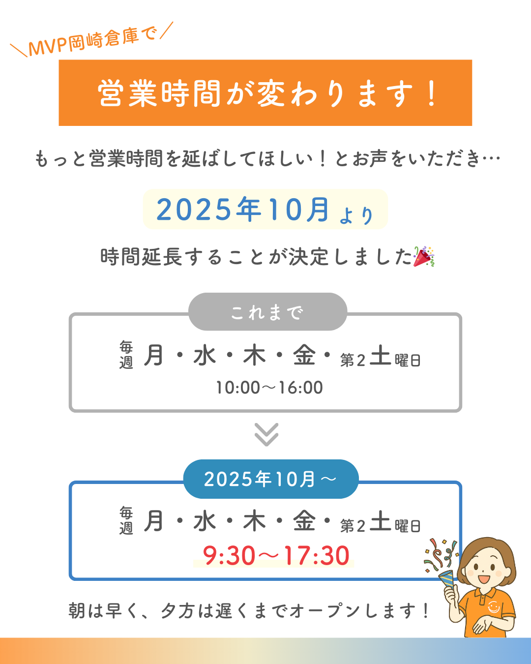 MVP岡崎倉庫からのお知らせ📢 みなさまからの 「もっと営業時間を延ばしてほしい」 というありがたいお声にお応えして、 ✨2025年10月より✨ 岡崎倉庫の営業時間が変わります! ⏰ これまで:10:00〜16:00 ⏰ 新しい時間:9:30〜17:30 これまでより長く ご利用いただけるようになりました🌿 ぜひお気軽にお立ち寄りください📦 いつも温かいご協力をありがとうございます☺🧡 関連