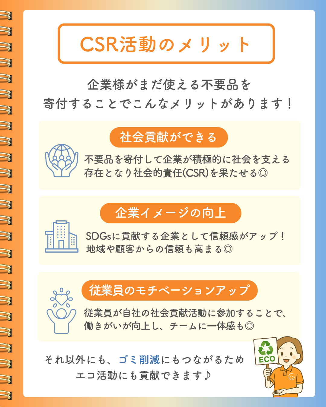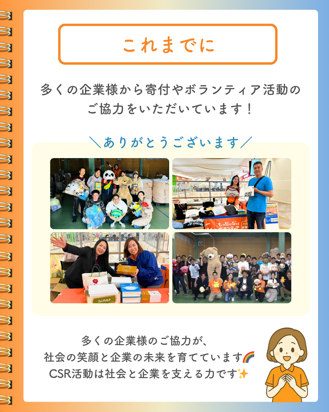 企業の皆さまの想いが集まり、 “社会の笑顔”と“企業の未来” Wのメリットが生まれています🌸 寄付やボランティアを通じて 子どもたちの教育支援や障がい者の雇用づくりなど さまざまな支援につながっています。 CSR活動は社会貢献になるだけでなく、 企業の信頼や価値を高める力にもなります✨ そして、こうした取り組みは 企業様だけでなく、個人の皆さまの寄付やご協力からも広がっています🌿 私たちと一緒に、“やさしい循環”を広げてきませんか? 関連